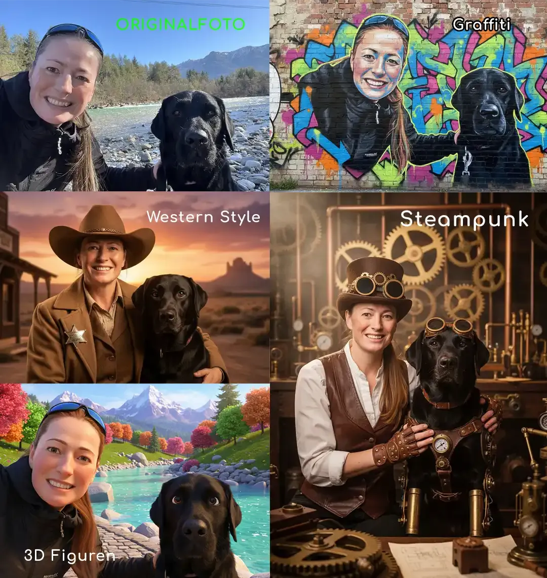 Das Besondere an pawdraw.ai: Im Gegensatz zu vielen anderen Apps auf dem Markt ist pawdraw.ai nicht auf reine Tiergesichter beschränkt. Die KI ist darauf trainiert, die einzigartige Bindung zwischen Mensch und Tier einzufangen. So können auch Fotos von Besitzern gemeinsam mit ihren Haustieren hochgeladen werden – die App transformiert beide Charaktere nahtlos in das gewählte künstlerische Thema, ohne dabei die Ästhetik zu verlieren.