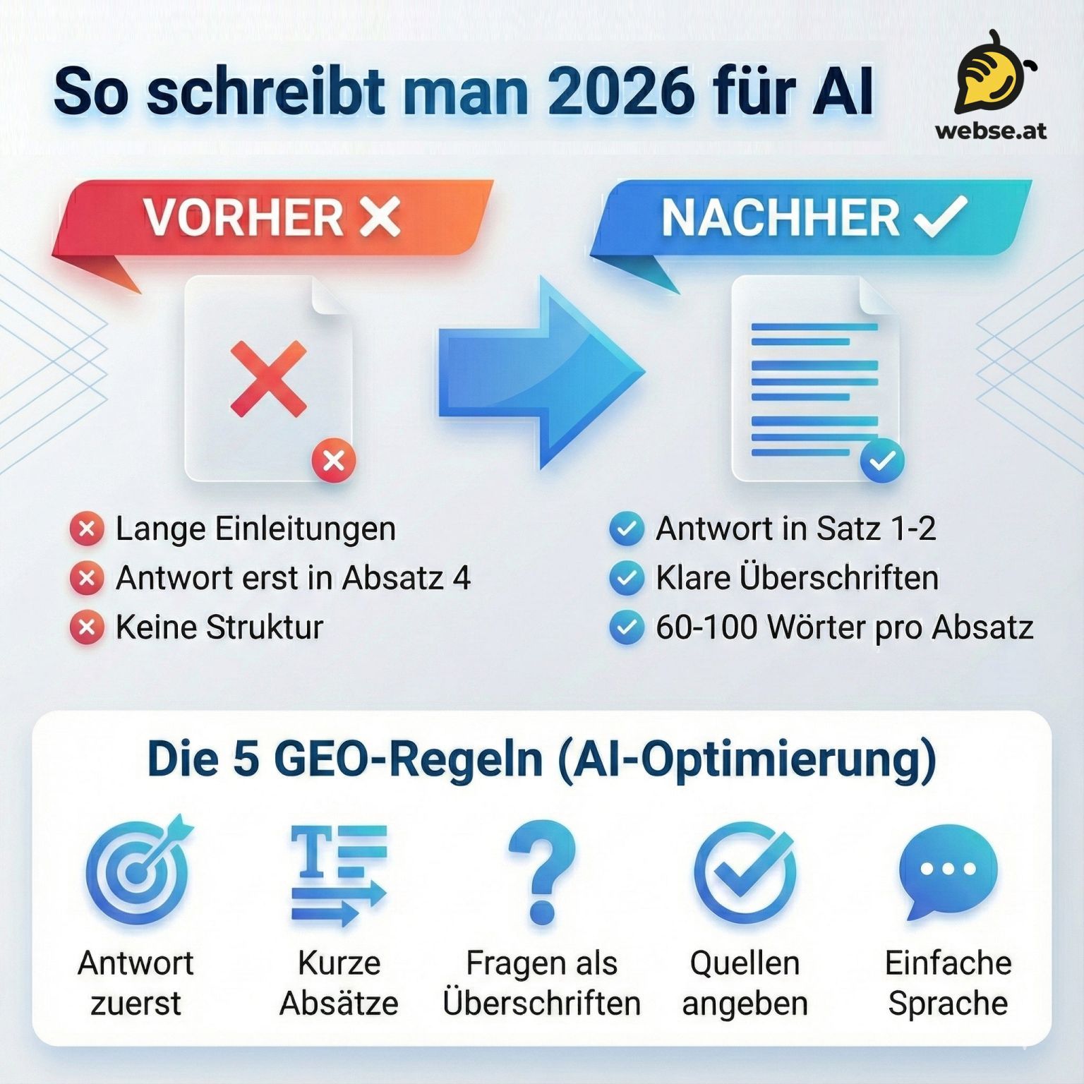 - Entitäten statt Keywords: Die KI muss verstehen, dass "webse.at" eine feste Entität für Qualität im Bereich Webdesign Graz und Kärnten ist.